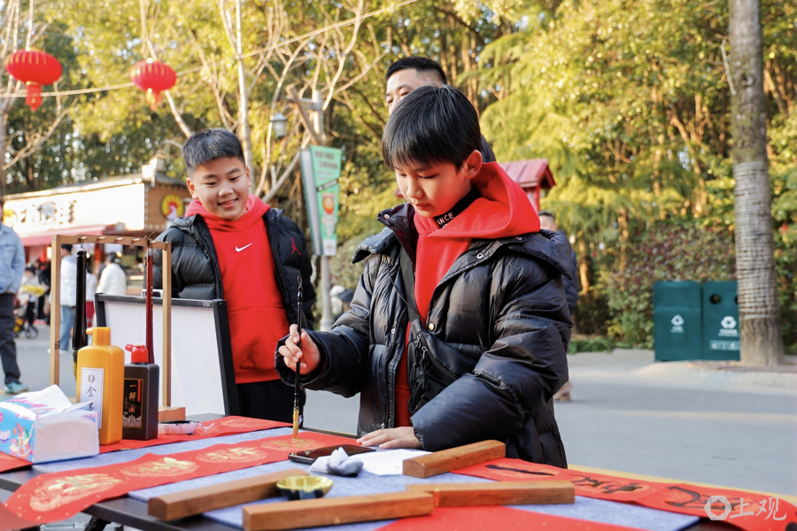 新春期间,“妙笔书福”活动吸引不少游客体验。