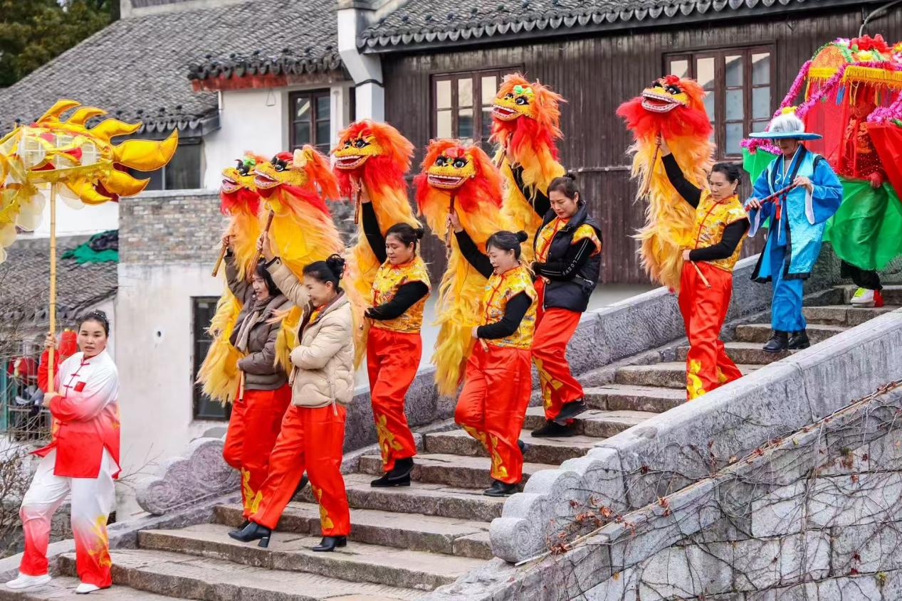 奉贤区青村镇的青溪老街,张灯结彩,热闹非凡。700余个宫灯、藤球装点全域,各类春节小景装扮各打卡点位。剪纸、钩针、扎染、漆扇等众多非遗项目和传统手工艺纷纷亮相,小青龙、手龙、手狮等民俗表演组成巡游队伍,在老街内巡游、展演,与市民游客亲密互动、合影留念。