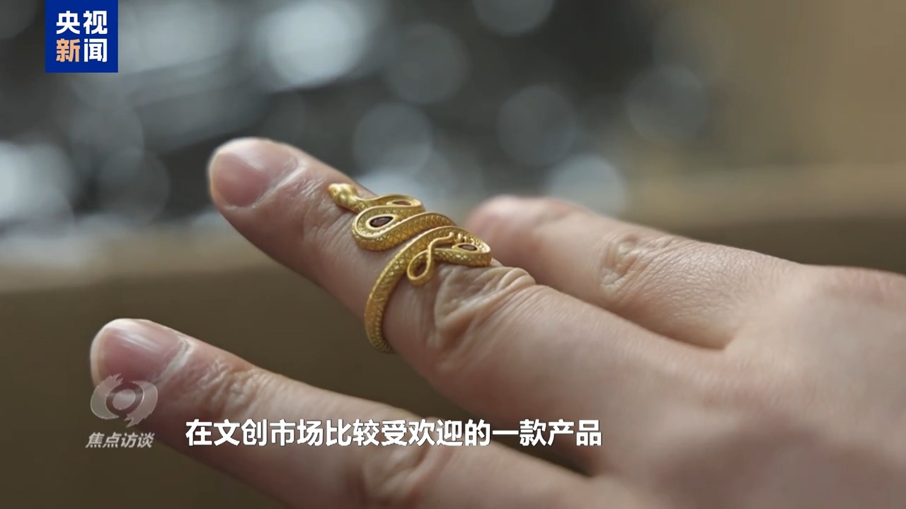 义乌某饰品公司总经理吴昊:这个是我们给国家博物馆做的一款新年生肖款,你看看,这个是一款戒指,就适合当下年轻人,在文创市场比较受欢迎的一款产品。