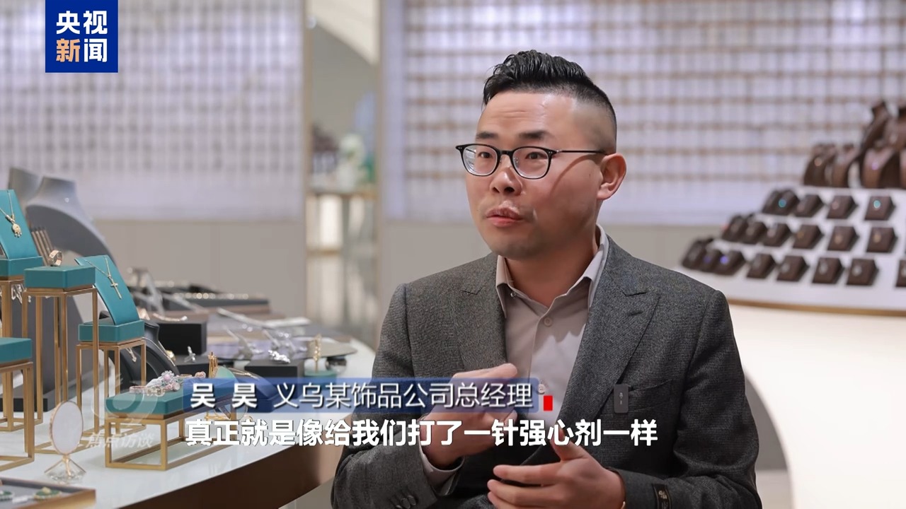 义乌某饰品公司总经理吴昊:总书记提出了国内国际双循环的事,对我们企业来说,真正就是像给我们打了一个强心剂一样,就是坚定了我们未来发展方向,企业就没有那么迷茫了。
