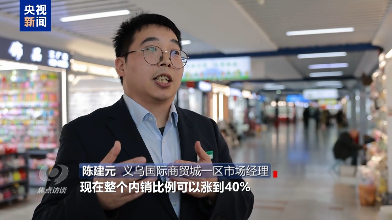 义乌国际商贸城一区市场经理陈建元:我们有一个统计,拿我们的饰品行业来说,经过这几年培育,直播电商的快速发展,有些经营户转型,现在整个内销比例可以涨到40%,比例还是有一个很明显的提升。