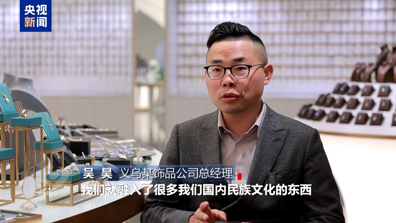 义乌某饰品公司总经理吴昊:在这一块,融入了很多我们国内民族文化的东西,重新组合去创造,他们都会喜欢这个东西。其实归根结底,还是我们通过这么多年的发展,我们国家人民的日子越过越好的时候,这个民族文化的自信是从国人的骨子里面迸发出一种自信的体现。