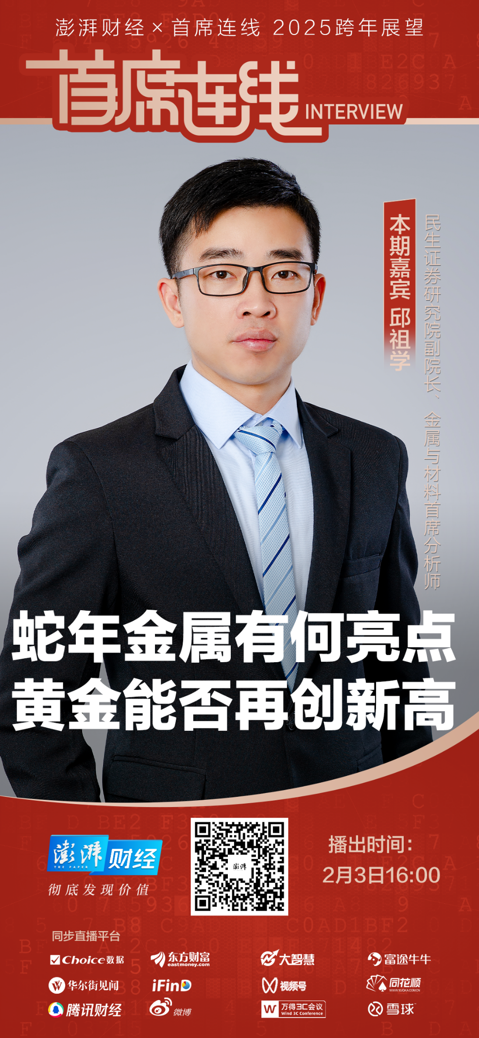 2月3日,民生证券研究院副院长、金属与材料首席分析师邱祖学做客澎湃新闻“轻舟必过万重山”——《首席连线》2025跨年市场展望节目,带来分析和展望。