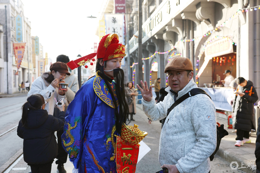 “财神爷”巡回向游客“迎春纳福”,祝福大家新年招财进宝。