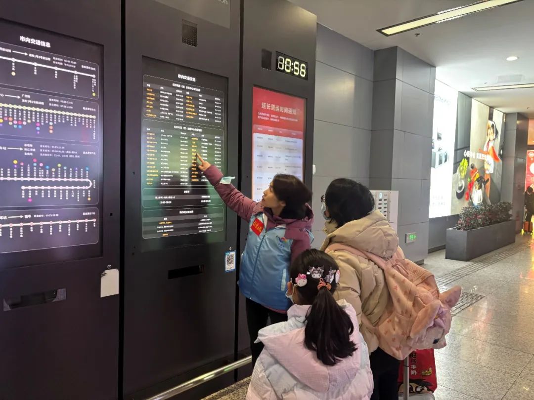 早上8点,梁晓冬提前到达了集合点,与其他志愿者一起参加了简短的晨会。作为2号点位的点位长,他需要协调好本点位的志愿者工作,确保服务有序进行。在志愿者服务点位上,志愿者们分工合作,为来往的旅客、市民提供引导服务。在志愿服务过程中,不少旅客对换乘路线、购票方式等有疑问。梁晓冬利用枢纽内的电子交通指示牌和时刻表,耐心为他们解答。