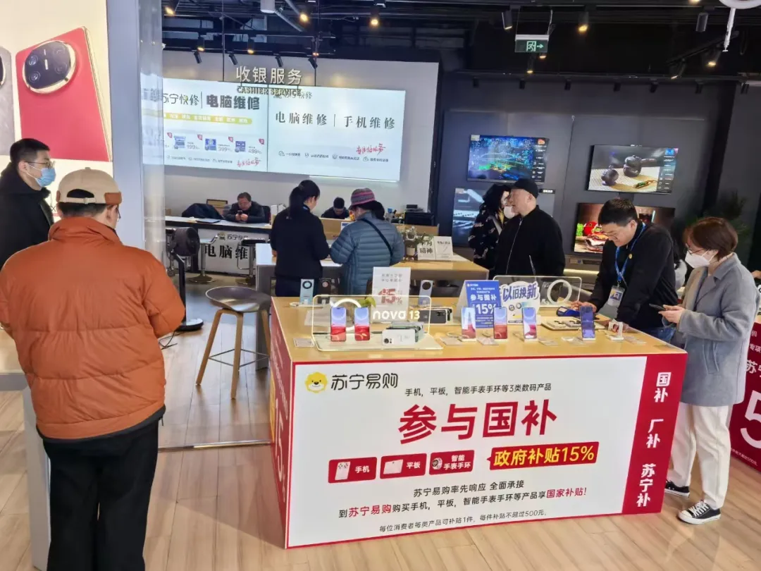 今年苏宁易购率先承接“国家家电3C以旧换新补贴”发放工作。即日起至12月31日,消费者在苏宁易购门店购买手机、平板电脑、智能手表3类3C产品,可享15%专项补贴,单件商品至高补贴500元。