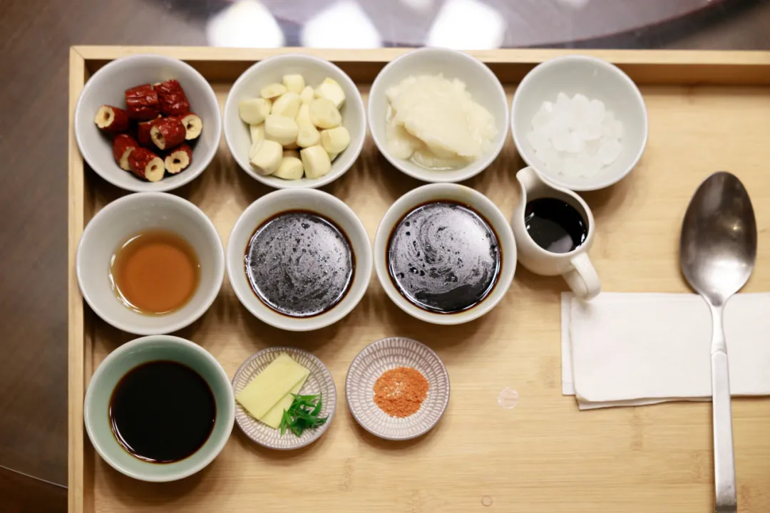 配料:蒜瓣红枣猪油黄酒海胆末葱花姜片猪骨高汤鳗鱼汁(由生抽、老抽和冰糖调制而成)