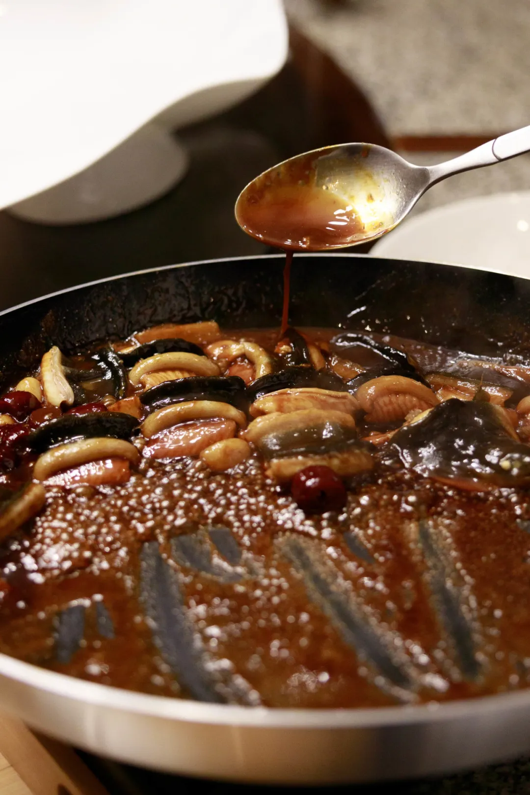 3.下入高汤,放入几颗红枣,煎好的蒜瓣,随后浇上鳗鱼汁加盖,中大火焖15分钟。