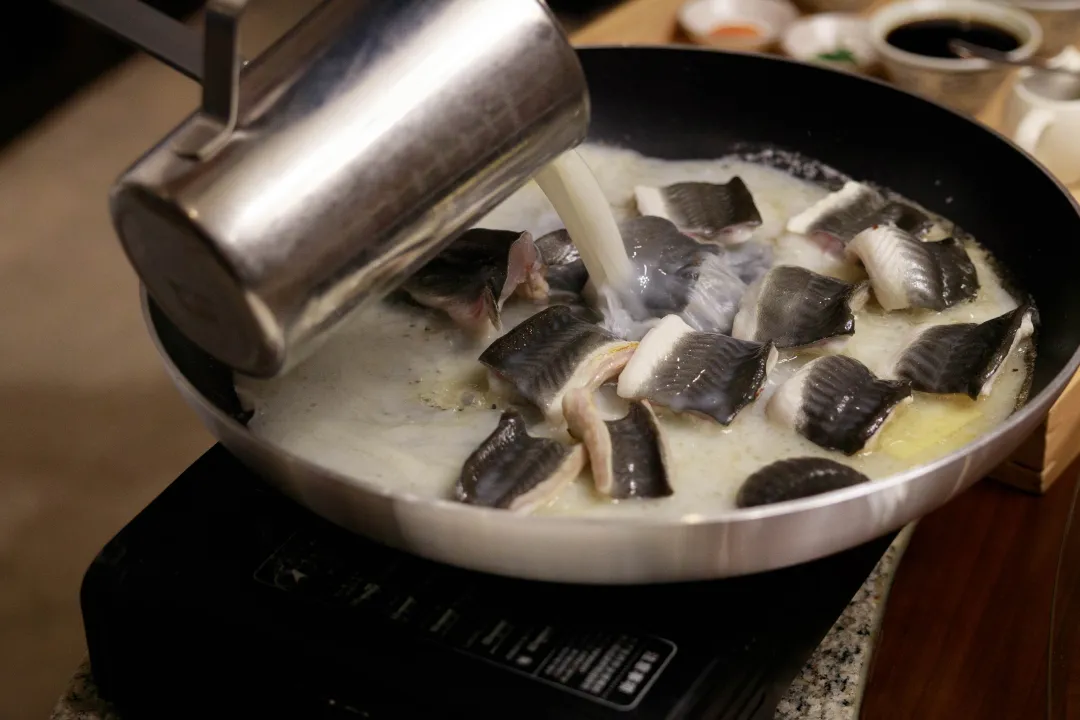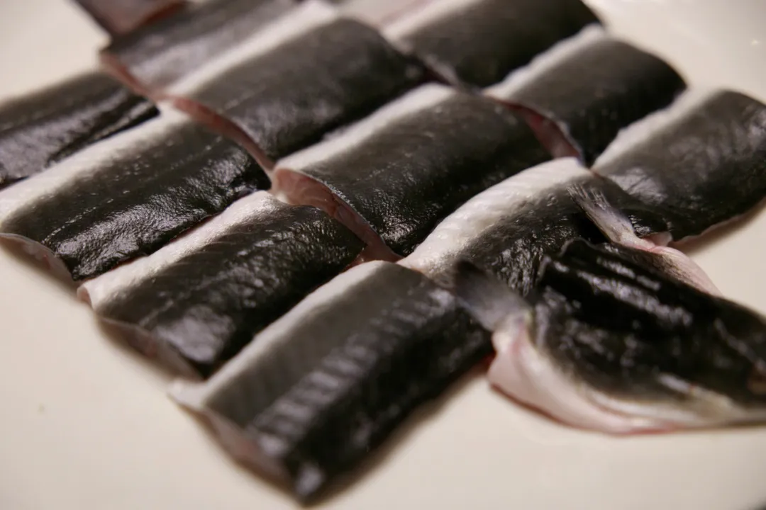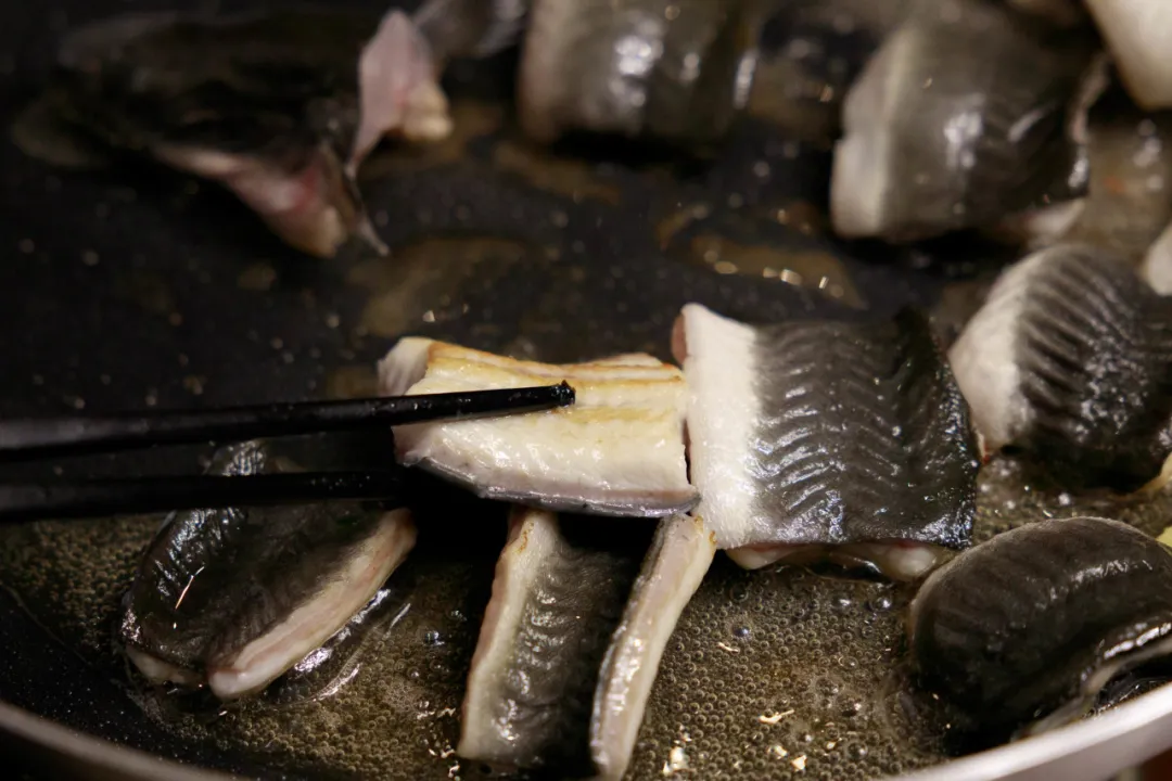 2.鳗鱼肉朝下,皮朝上,放入锅煎,鱼肉有一些金黄色即可。家里烧的时候建议用不粘锅,油温高的时候下肉。