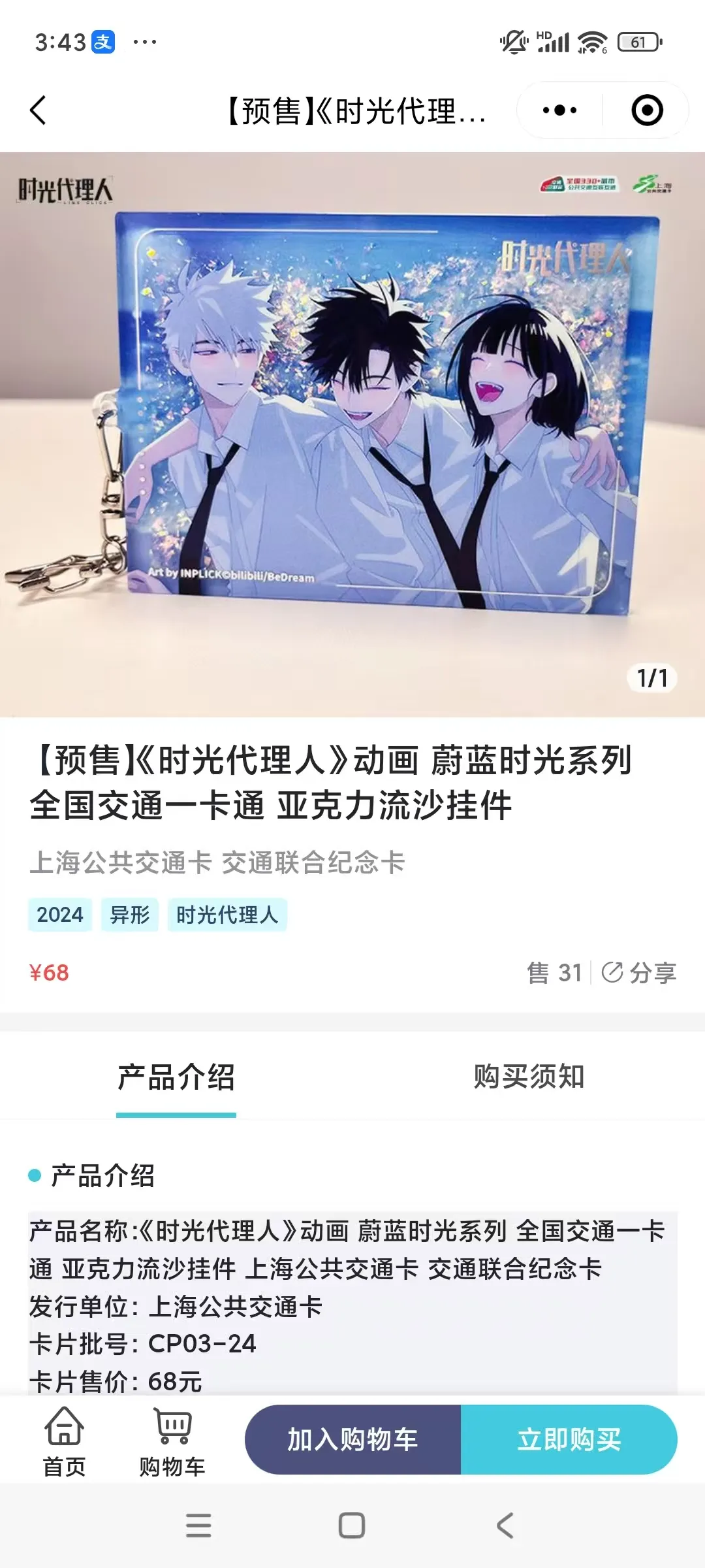 进入小程序【上海都市旅游卡】搜索“时光代理人”进入到【《时光代理人》动画:蔚蓝时光系列-全国交通一卡通亚克力流沙挂件】的售卖界面