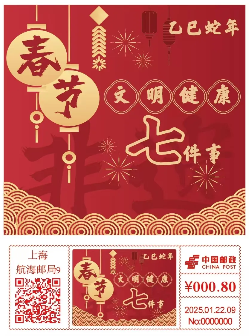 ▲今年春节前夕,上海在全国率先推出“春节文明健康七件事:品味年俗、打扫整理、健康饮食、科学运动、规律作息、心理健康、文明出行。航海邮局以此为题材,特别发行“春节文明健康七件事”邮资机戳一枚,吸引了不少集邮爱好者前来加盖集戳。