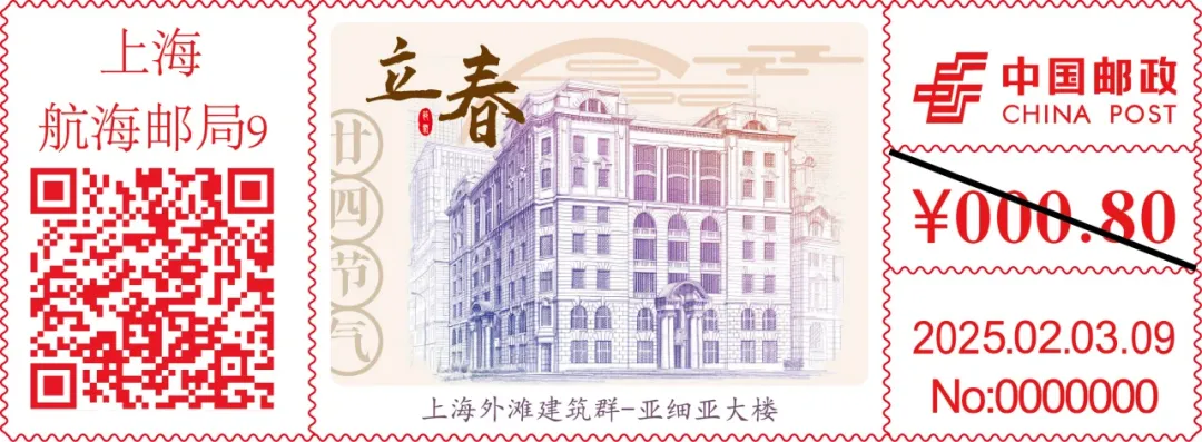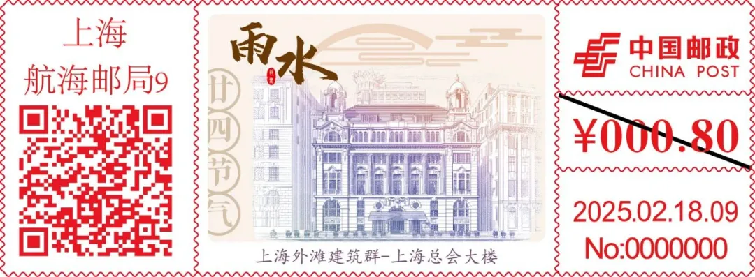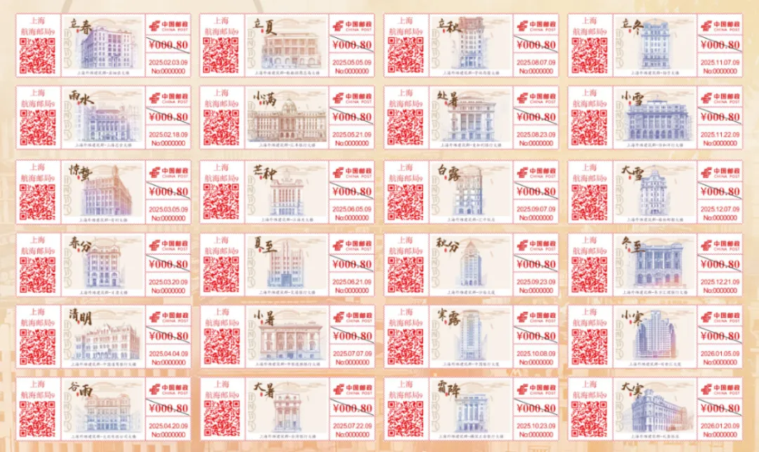 记者注意到,与以往的草木主题不同,此次发行的“二十四节气”系列邮资机戳,图案取材于上海外滩建筑群,全套共24枚,于2025年2月3日至2026年1月20日期间由航海邮局陆续发行。