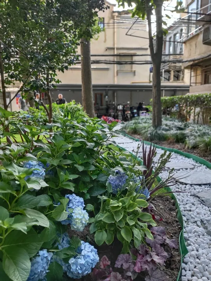 “银杏树下幸福径”所处的位置,矗立着11棵挺拔的银杏,树下曾经只有外露斑驳的土壤,以及周边生长茂密的麦冬,居民们根本无法步入。经过“一方花田”自治项目改造,这里被平整的草坪、盛开的绣球花和错落有致的地被植物所取代,尤其是入秋之后,金黄的银杏树叶飘落,铺撒在树下的“幸福径”上,也填满了居民心中的“一方花田”。