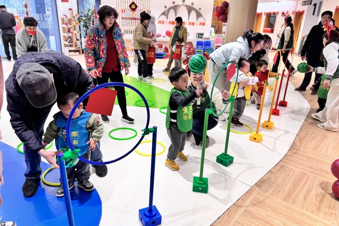 “球跃福门”游戏则将现场气氛推向高潮。孩子们手持小球,奋力投入挂有福字的“福门”,寓意新年福气满满。每当小球成功投入,现场便响起阵阵欢呼声,孩子们的脸上也洋溢着笑容。