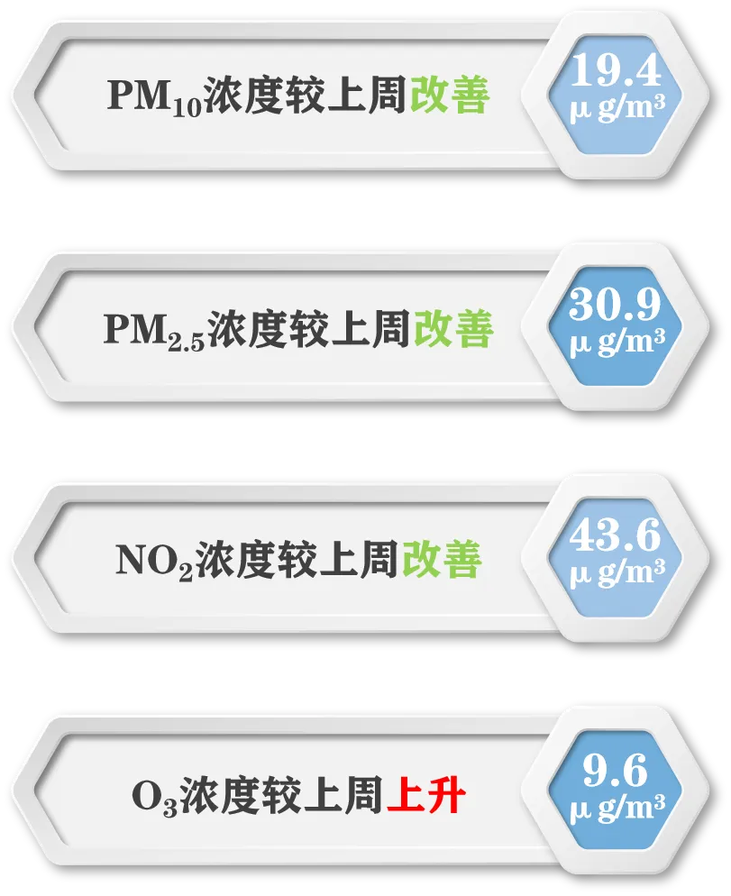 本周各环境指标和上周相比变化如下: