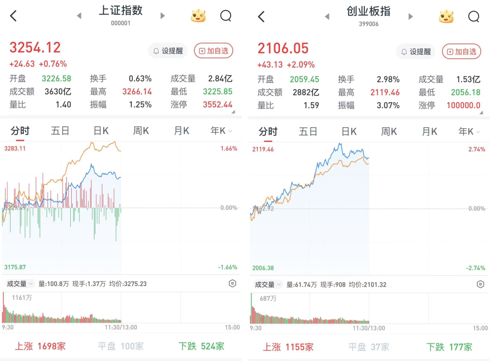 至午间收盘,上证综指涨0.76%,报3254.12点;科创50指数涨2.14%,报1003.91点;深证成指涨1.43%,报10309.95点;创业板指涨2.09%,报2106.05点。