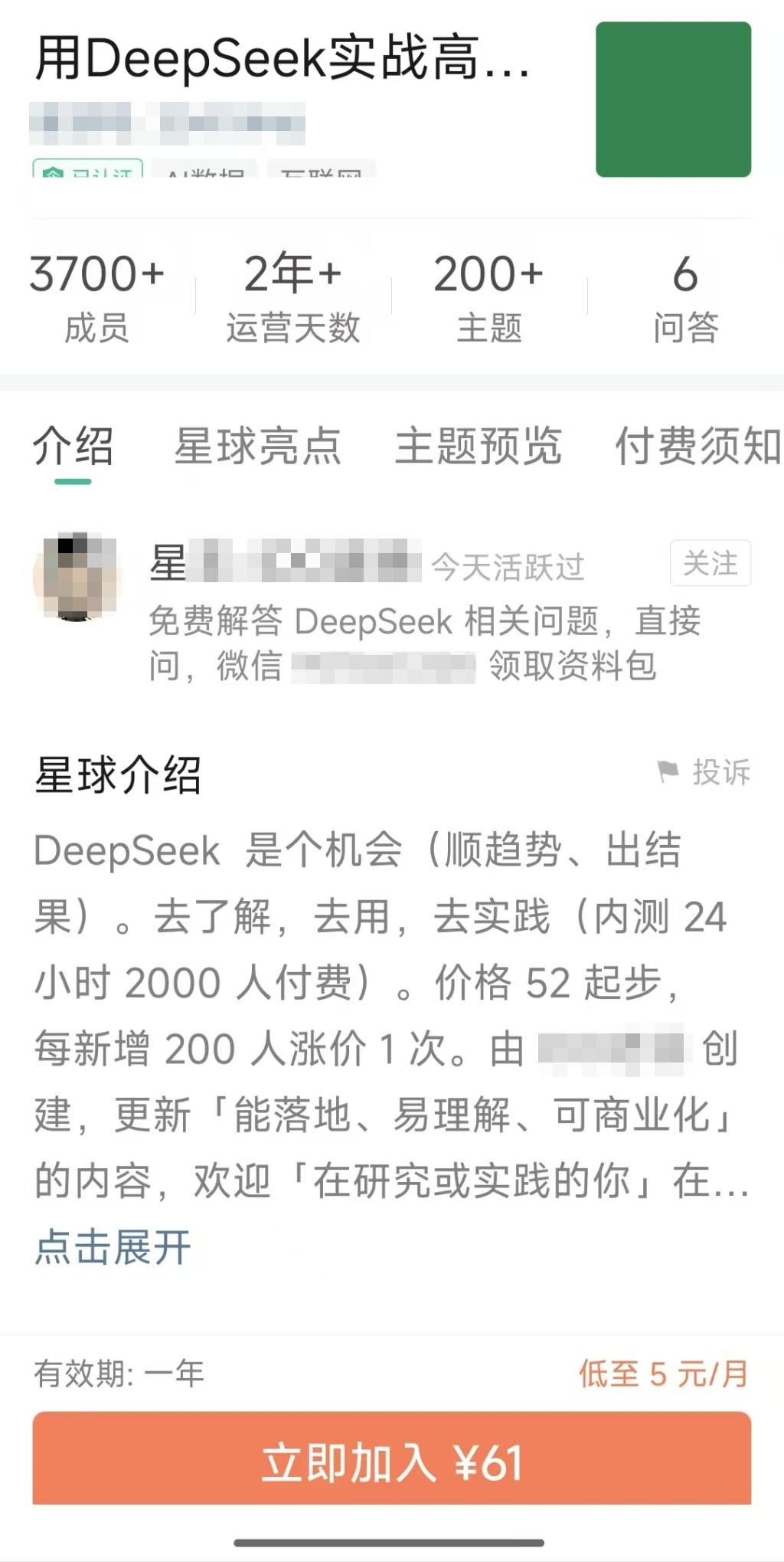澎湃新闻记者查询发现,某热门DeepSeek社区会员费为61元,总会员数超过3600人,在DeepSeek爆红的近一个月里,仅会员费收入就超过18万元。