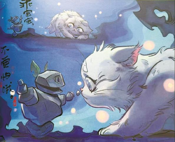 绘本故事中,石矶娘娘住的山里闯进了一只小猫咪,魔镜告诉她高大的样子可能会吓到猫咪,于是她就变成小石头人的样子与猫咪成了好朋友(见上图),她还给小猫咪起名叫“虎子”。有一天她和猫咪玩耍的时候碰见了一只野兽,为了保护小猫咪,她恢复了高大的样貌吓跑了野兽,也吓跑了“虎子”。于是石矶娘娘又变成了孤身一人,直到有天小猫回来,告诉她自己找到了妈妈,真的要离开山里了,石矶娘娘则含泪与小猫做了正式的告别。暖心的故事看哭了很多观众。