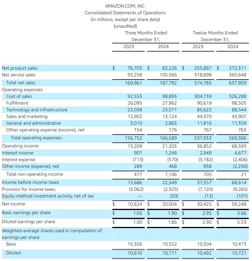 当地时间2月6日,亚马逊发布了2024年第四季度财报,四季度营收同比增长10%至1877.9亿美元,高于市场预期的1873亿美元;净利润200.04亿美元,与上年同期的106.24亿美元相比大幅增长88%;稀释后每股收益为1.86美元,高于市场预期的1.49美元;营业利润同比增长61%至212亿美元,营业利润率从上年同期的7.8%上升到11.3%。