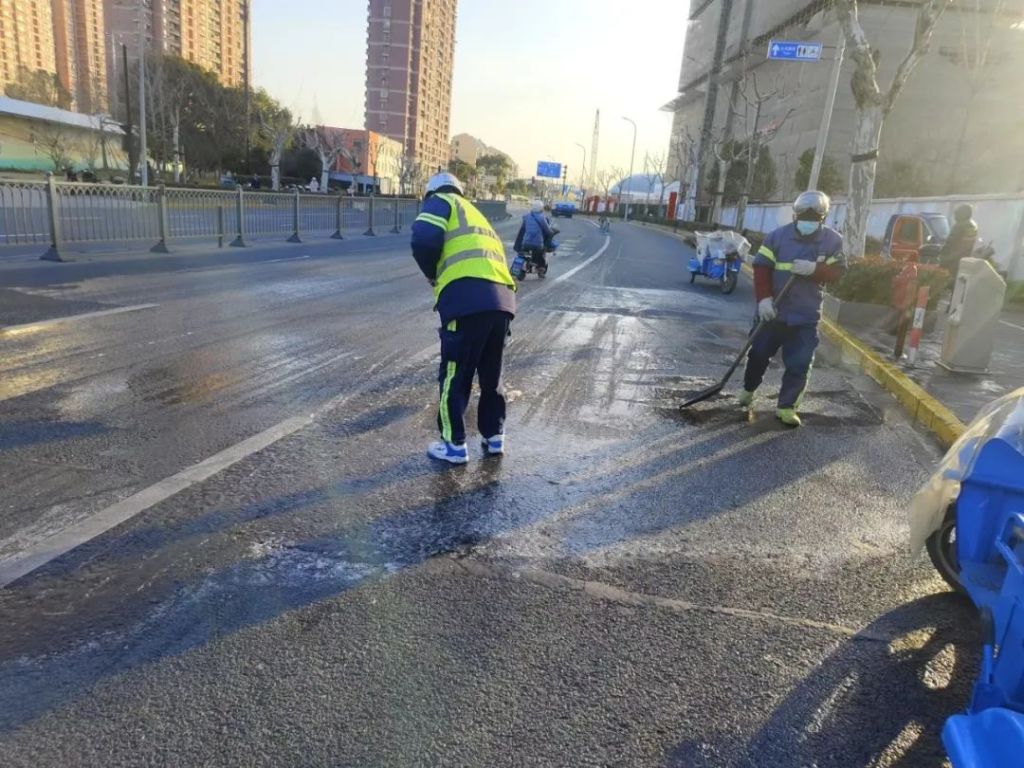 环卫人员加强道路清扫和除冰。 上海市绿化市容局 图