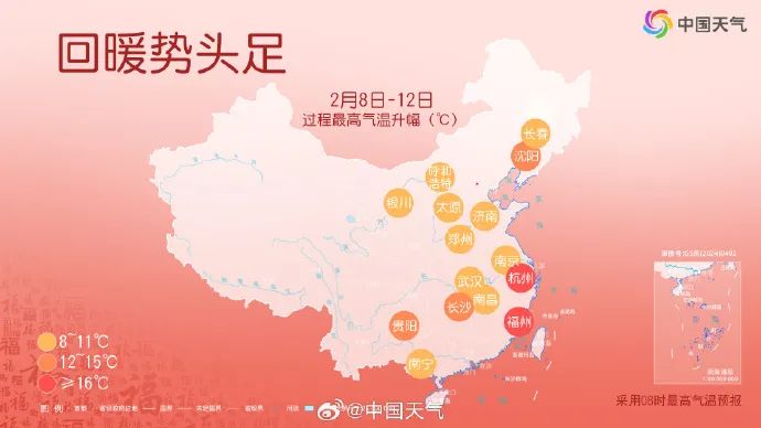 今后5天,中东部大部城市累计升温幅度将超过8℃,其中像沈阳、长沙、贵阳升幅可达12-15℃,杭州和福州升幅还将超过16℃。