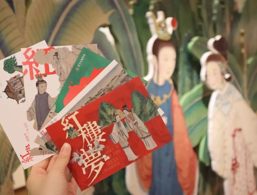 展厅以《清孙温绘全本红楼梦图》为主线,分为“红楼与大观”、“木石与金玉”、“太虚与大荒”三个单元。展厅通过人体立牌、大型画面和造景装置搭建了“游园”结构,让观众“沉浸式”地步入“大观园”。