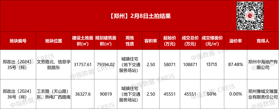 位于中原区的郑政出〔2024〕36号(网)地块被郑州豫城文臻置业有限责任公司以底价4.5551亿元摘得。该公司由郑州中原城市开发建设投资有限公司100%持股。