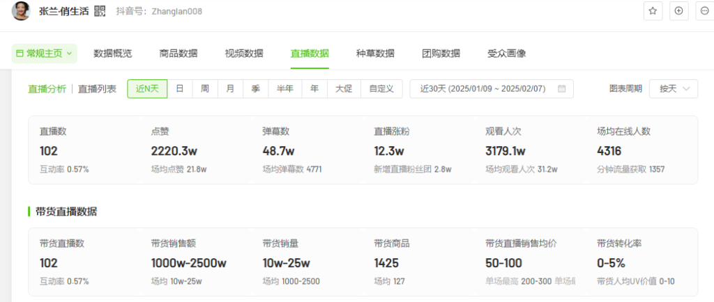 “张兰·俏生活”账号近期高密度进行直播,据飞瓜数据显示,截至2月7日,近30天该账号有102场带货直播,观看人数超三千万,直播涨粉12.3万人,创造了1000万元至2500万元的销售额。其中,2月6日,在大S离世后,张兰曾在抖音首播带货,人气一度超越10万+。当时,张兰直播间开播30分钟,观看人数超350万,平均在线人数23.8万,在带货总榜上排名第四。虽然张兰直播在一小时后遭到封禁,但6号其销售额达到了100万至250万元,较2月3日直播销售额翻了4倍以上。