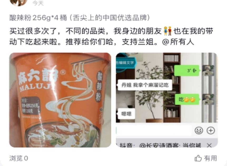 2月8日晚间,记者查看了抖音麻六记官方旗舰店的评论区,热榜第一的酸辣粉商品的最新评价显示,顾客下单购买的原因就包括了支持张兰与汪小菲。