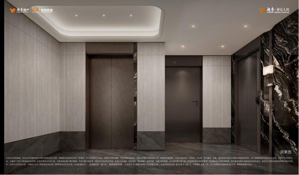 类一梯一户:私享入户,增加归家仪式感和收纳空间,对标五星级酒店大堂奢华质感,世界臻稀石材-泰晤士奢石打造尊崇入户私梯厅,让生活私密有度,出行从容自在。
