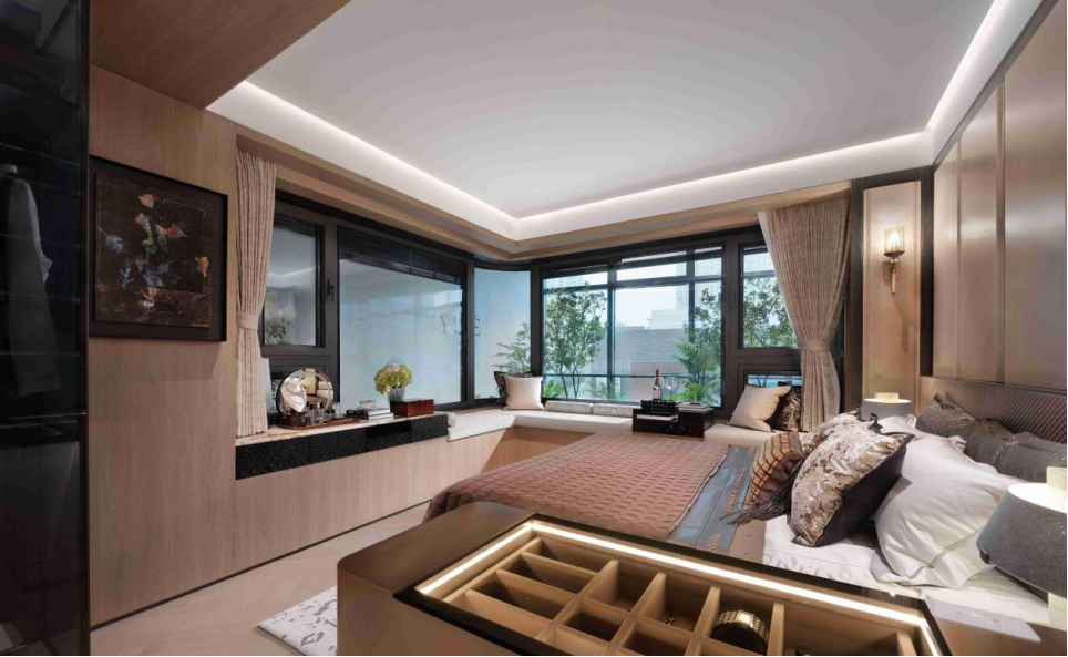 270°超大转角飘窗:是主人仰望浩瀚星空的所在,俯瞰静安繁华。三玻两腔Low-e玻璃系统窗,保证了主卧的极度静谧,兼顾功能与情感维度,创造全新的生活方式。