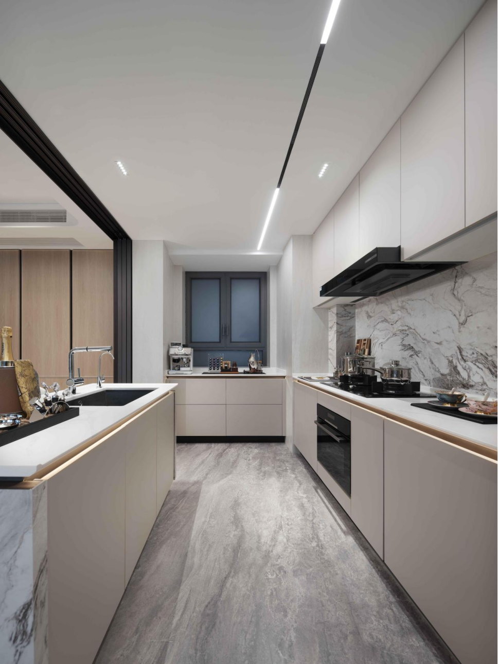 半开放厨房:厨房岛台设计,随心变身中餐厨区、mini西厨区、收纳空间、隔断空间和交流平台,充分满足掌勺人对厨房的一切空间想象。