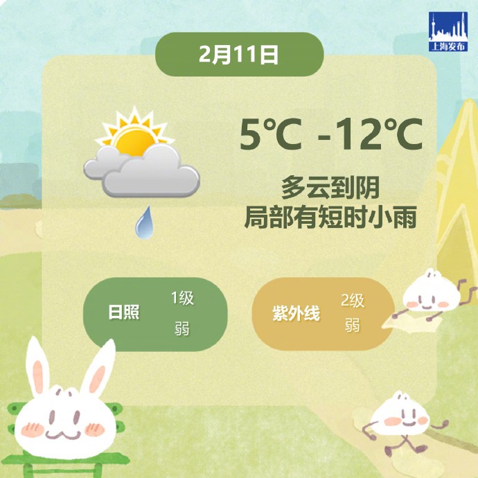 上海今天气温5℃-12℃,多云到阴局部地区有短时小雨,出行记得备好雨具