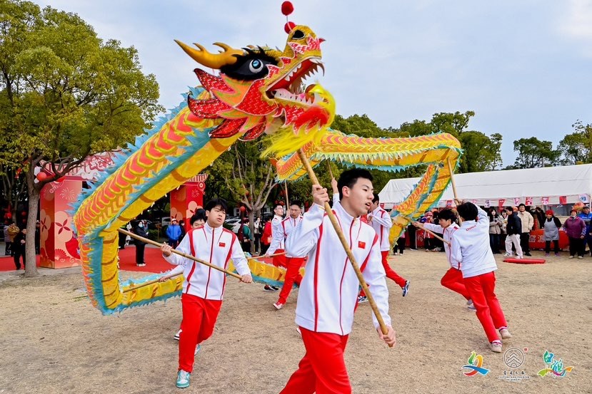 活动现场张灯结彩、丝竹齐鸣,伴随着清脆悦耳的曲调,白鹤丝竹班队员们随乐舞动各色丝竹乐器,或吹、或拉、或弹、或击,交织出一曲曲经典乐章,带领村民们步入江南民俗的盛宴。喝上一碗热腾腾的炀粉粥,大家在舞龙队伍的引领下一起体验“走三桥”,行走在田间地头,感受弄堂游戏、大家火、搭炀棚等独特元宵习俗的魅力。