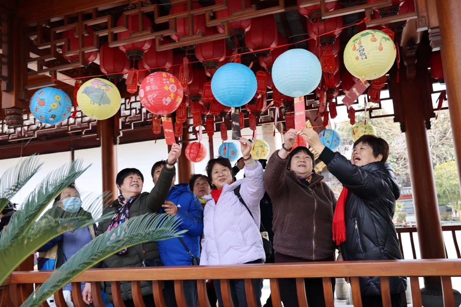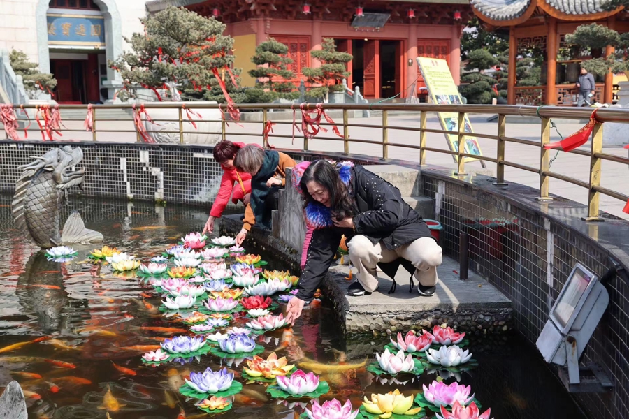 “希望全家人平平安安”“祝愿新的一年,心想事成”“新学期,学习进步”……元宵佳节,在位于沪郊朱泾的4A级景区东林寺前,不少市民手持各色花灯结伴而行,依次走过“福”“禄”“寿”三座桥,表达对新一年生活的美好祝愿。