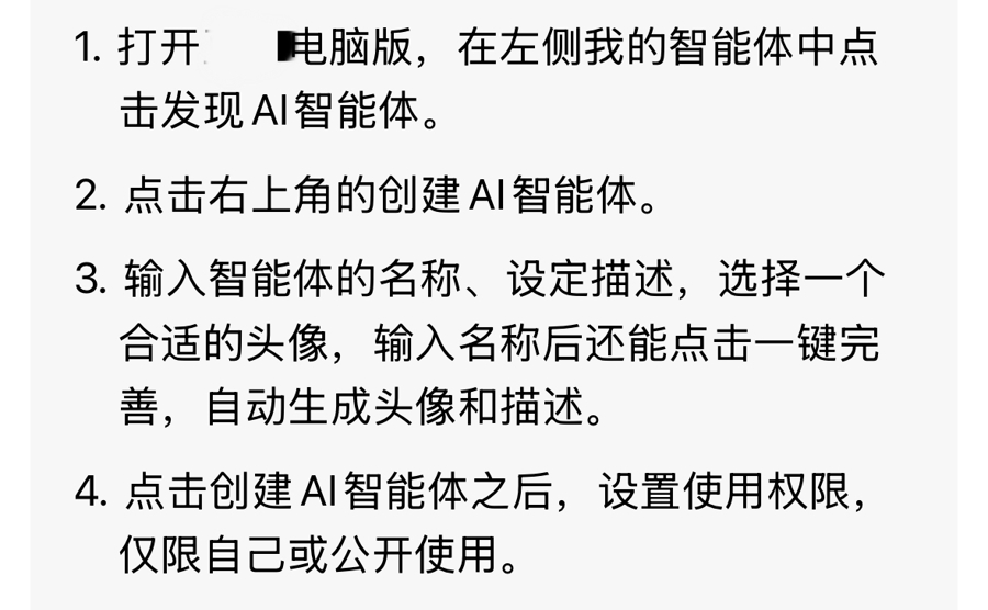 根据某大模型官方介绍,通过大模型App或网页版的相关按键,只要4步就能生成自己的“智能体”,分别是“点击(大模型对话框里的)‘发现智能体’”“创建AI智能体”“输入智能体名称、头像、描述”“设置使用权限,仅限自己或公开使用”。