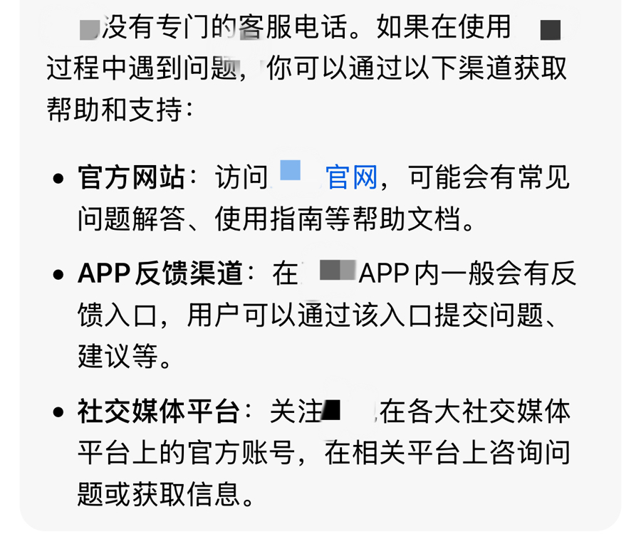 值得一提的是,目前很多大模型不仅没有隐私政策,甚至连最基本的客户服务也没有。记者向部分大模型提问“有没有客服电话”“有没有在线客服”,得到的答复都是“没有”。比如,有的大模型表示,用户如果有问题可以通过官网或APP查看使用指南等帮助文档,或者通过APP反馈入口反映问题。