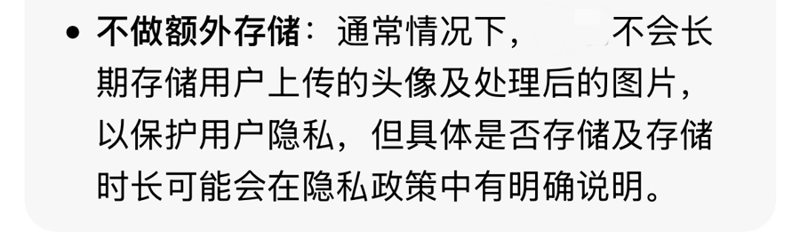 比如,记者向某个提供“AI头像生成”服务的智能体询问,它将如何处理用户上传的头像信息,仅被告知“不做额外存储,但具体是否存储及存储时长可能会在隐私政策中有明确说明”事实上,相关大模型和智能体压根就没有“隐私政策”。
