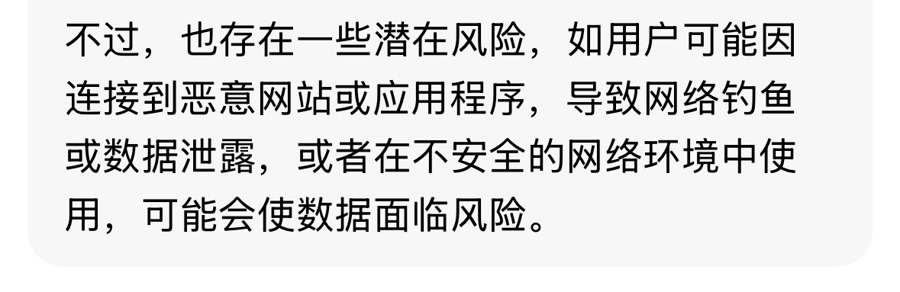 记者还将智能体的安全性话题抛给了对应的大模型,获得了一个似是而非的回答——“通常是安全的……不过,也存在一些潜在风险,如用户可能因连接到恶意网站或应用程序,导致网络钓鱼或数据泄露,或者在不安全的网络环境中使用,可能会使数据面临风险。”