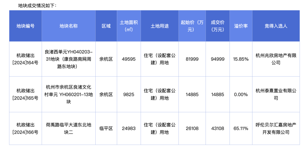此次出让的3宗涉宅地块起始总价约12.3亿元,地块分别位于余杭区(2宗)、临平区(1宗),地块实行自由竞价,按照价高者得的原则确定竞得人。