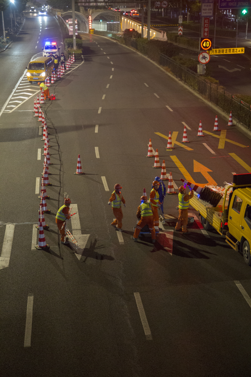 22时30分,工作人员在复兴东路隧道浦西出入口处设置交通锥形桶,引导非机动车通行。韩佳邑 摄
