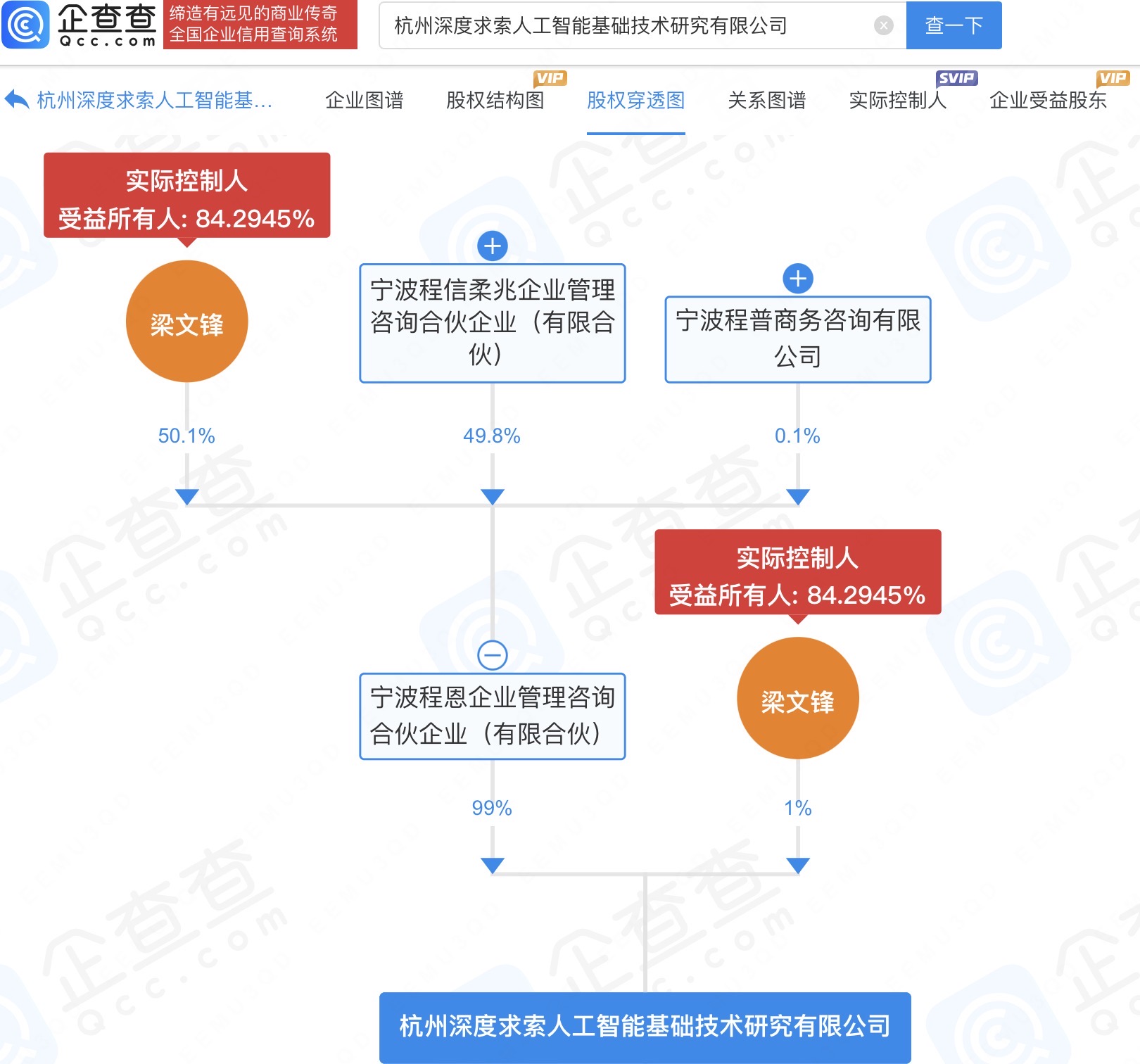 该公司成立于2023年,法定代表人为裴湉,含人工智能应用软件开发等业务,由梁文锋及其名下宁波程恩企业管理咨询合伙企业(有限合伙)共同持股。
