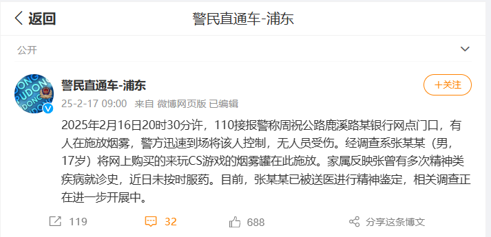 2025年2月16日20时30分许,110接报警称周祝公路鹿溪路某银行网点门口,有人在施放烟雾,警方迅速到场将该人控制,无人员受伤。经调查系张某某(男,17岁)将网上购买的来玩CS游戏的烟雾罐在此施放。家属反映张曾有多次精神类疾病就诊史,近日未按时服药。目前,张某某已被送医进行精神鉴定,相关调查正在进一步开展中。