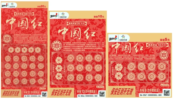 体彩经典系列即开票“中国红”,从2014年上市以来一直深受购彩者喜爱。“中国红”共有20元、10元、5元三种面值,对应头奖分别为100万元、25万元、10万元,供不同消费喜好的购彩者随意挑选。