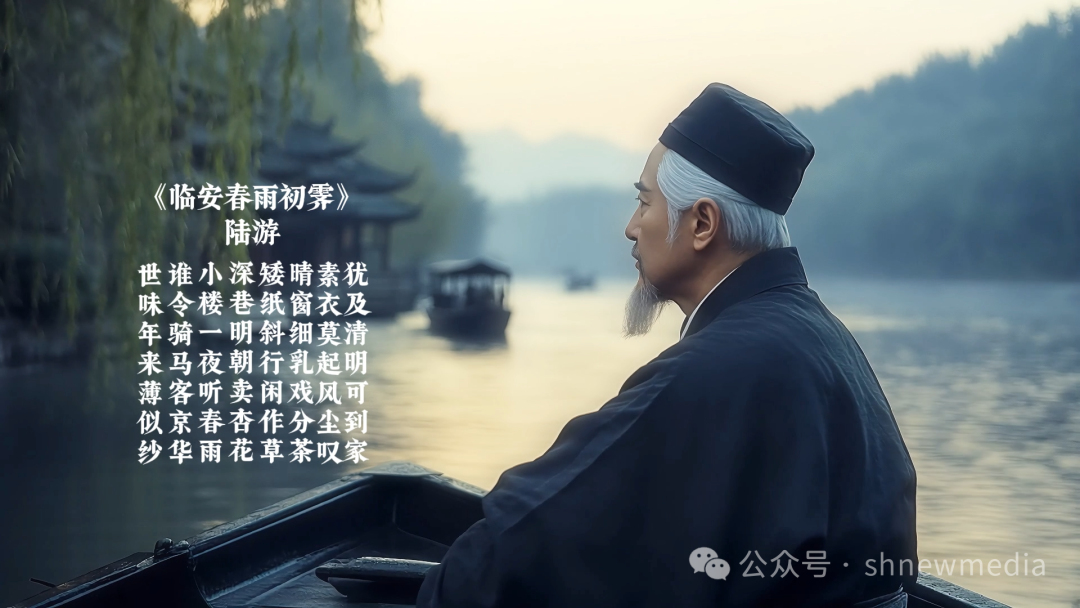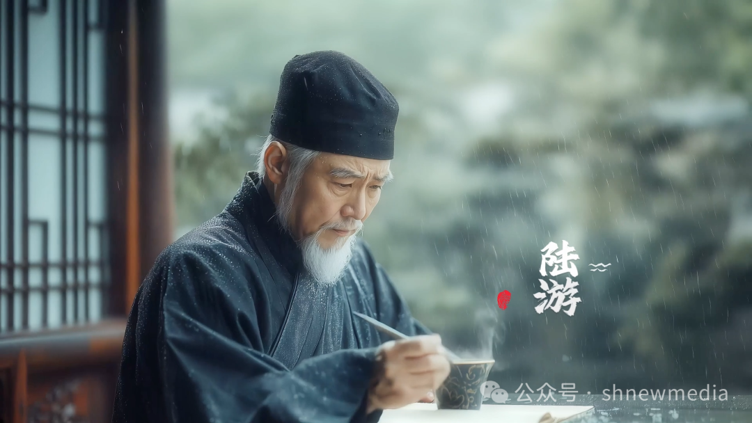 西湖边的客栈里,诗人陆游正在窗边写诗。
