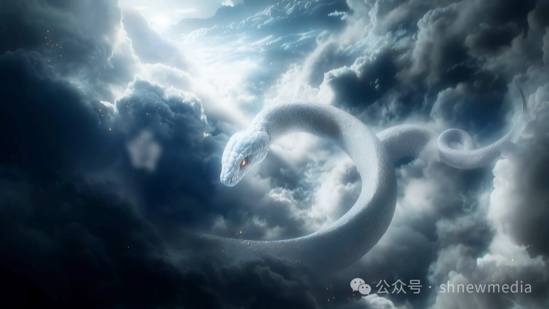 突然,天空中划过一道闪电,一条白色的巨蛇横空出世,它上下飞舞,姿态无比美丽。