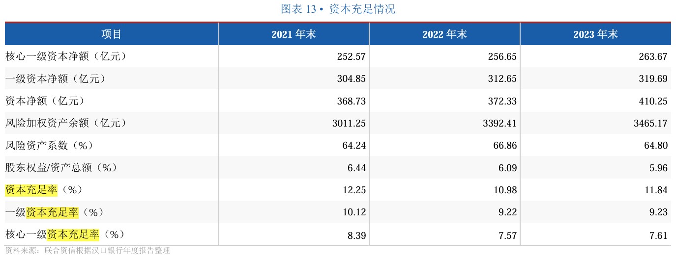 净利润增长放缓,汉口银行资本也有所承压。报告期末,汉口银行资本充足率依次为12.25%、10.98%、11.84%;一级资本充足率为10.12%、9.22%、9.23%;核心一级资本充足率为8.39%、7.57%、7.61%,连续两年接近7.5%的监管下限。