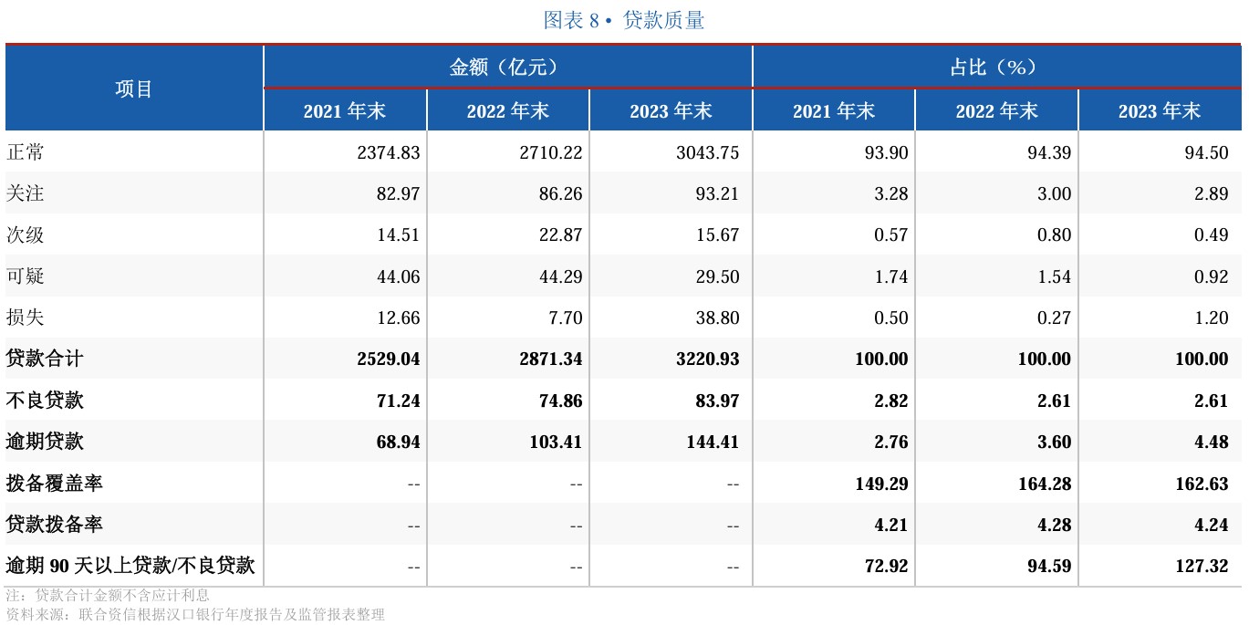得益于不良资产处置力度加大等,近年汉口银行不良率有所走低。2021年至2023年末,汉口银行不良贷款分别为71.24亿元、74.86亿元、83.97亿元,不良贷款率依次为2.82%、2.61%、2.61%。不过,同期末,汉口银行逾期贷款逐年增加,分别为68.94亿元、103.41亿元、144.41亿元,两年间翻了一倍;逾期贷款占比依次为2.76%、3.60%、4.48%,或面临不良走高的风险。