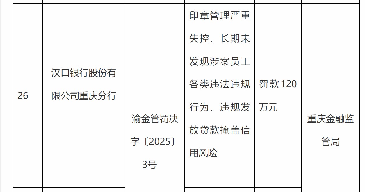 内控合规方面,汉口银行存在的问题不少。1月10日,据国家金融监管总局通报,汉口银行重庆分行被处以罚款120万元,原因是该行存在“印章管理严重失控、长期未察觉涉案员工各类违法违规行径、违规发放贷款掩盖信用风险”的违法违规行为。其中,“印章管理严重失控”在国家金融监管总局所开具的罚单中较为罕见。