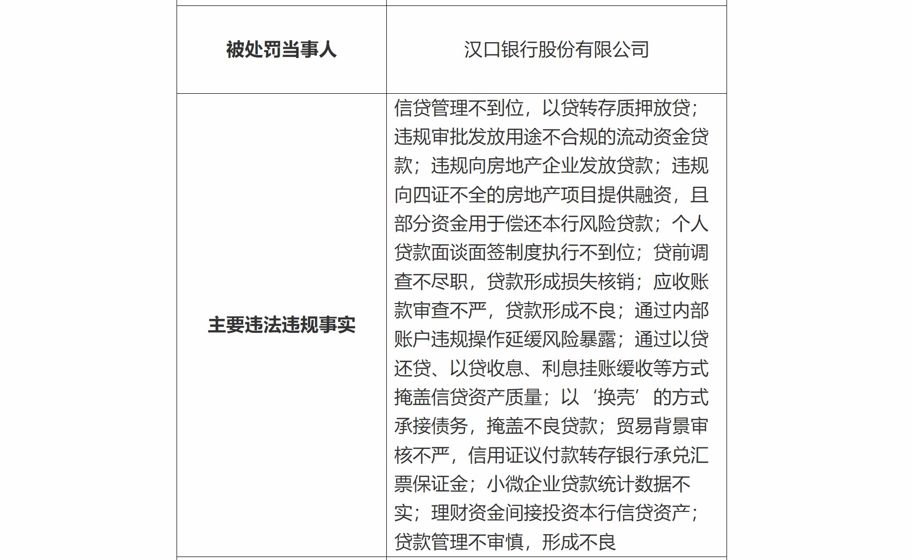 当时有媒体指出,该处罚或与多年前1.5亿元骗贷案有关。据裁判文书网,涉案相关方分别被控骗取贷款、票据承兑罪以及违法发放贷款等,最终造成汉口银行实际损失1.3亿余元。